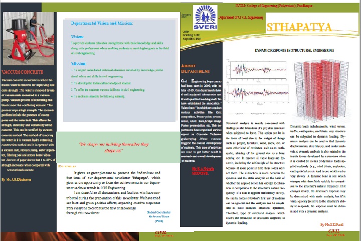 The department of civil engineering was established in 2009.Since it is establishment the department has been achieving success in both the academic and extra curricular activities.The department has well-qualified faculty members who are dedicated for the overall development of the students.Guest lectures seminars and different guidance sessions are regularly arranged for overall development of the student. The students are made aware about the actual work in the field of the Civil Engineering through the site visits.The results of the students in MSBTE examinations are remarkable and some students at the top levels of the achievements. The department has well furnished Laboratories with the required facilities and equipments.It is the aim of this department to produce efficient civil engineers with all the required skill in the field.