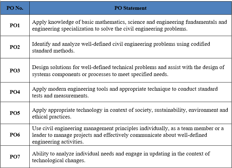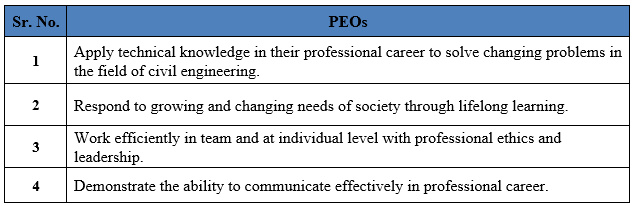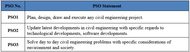 To provide diploma education strengthened with basic knowledge and skills along with professional ethics enabling students to reach higher goals in the field of civil engineering.